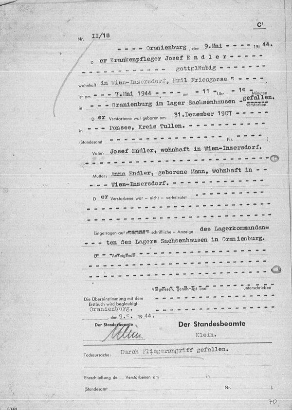 Josef Endler befand sich 1944 in Berlin-Lichterfelde, einem Außenkommando des KZ Sachsenhausen (Häftlingsnummer 17403). Bei seinem Arbeitseinsatz im Reichssicherheitshauptamt, das am 7.5.1944 durch einen Fliegerangriff bombardiert wurde, kam er mit 28 weiteren Häftlingen ums Leben. Mit ihm sind am gleichen Tag auch die Zeugen Jehovas Anton Platzer und Johann Stossier gestorben. Im Reichssicherheitshauptamt waren fünf Bibelforscher beim Umbau des Bunkers für Himmler eingesetzt.